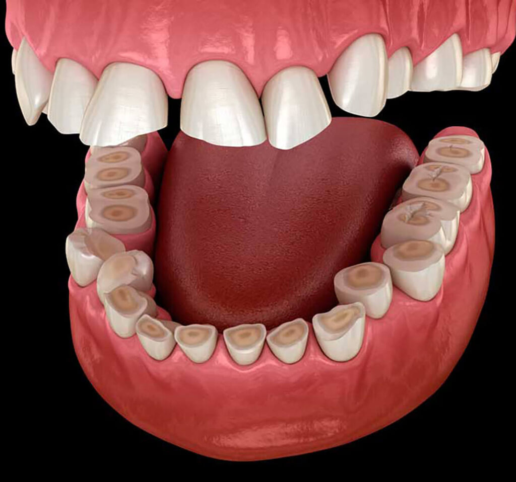 2. Előrehaladott állapotban a fogazat és a harapás helyreállítására is szükség lehet. Így sor kerülhet még gyökérkezelésre, esztétikus koronák általi mosoly korrekcióra és harapásemelésre, illetve foghiány pótlására fogászati híd vagy implantátum segítségével.