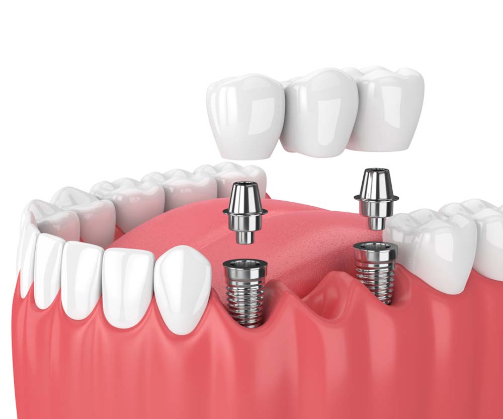 - Ha egymás mellett több fog is hiányzik, akkor a rést több implantátummal úgy is kitölthetjük, hogy az implantátumok lesznek majd a híd tartópillérei, így a saját fogak továbbra sem érintettek a kezelésben.