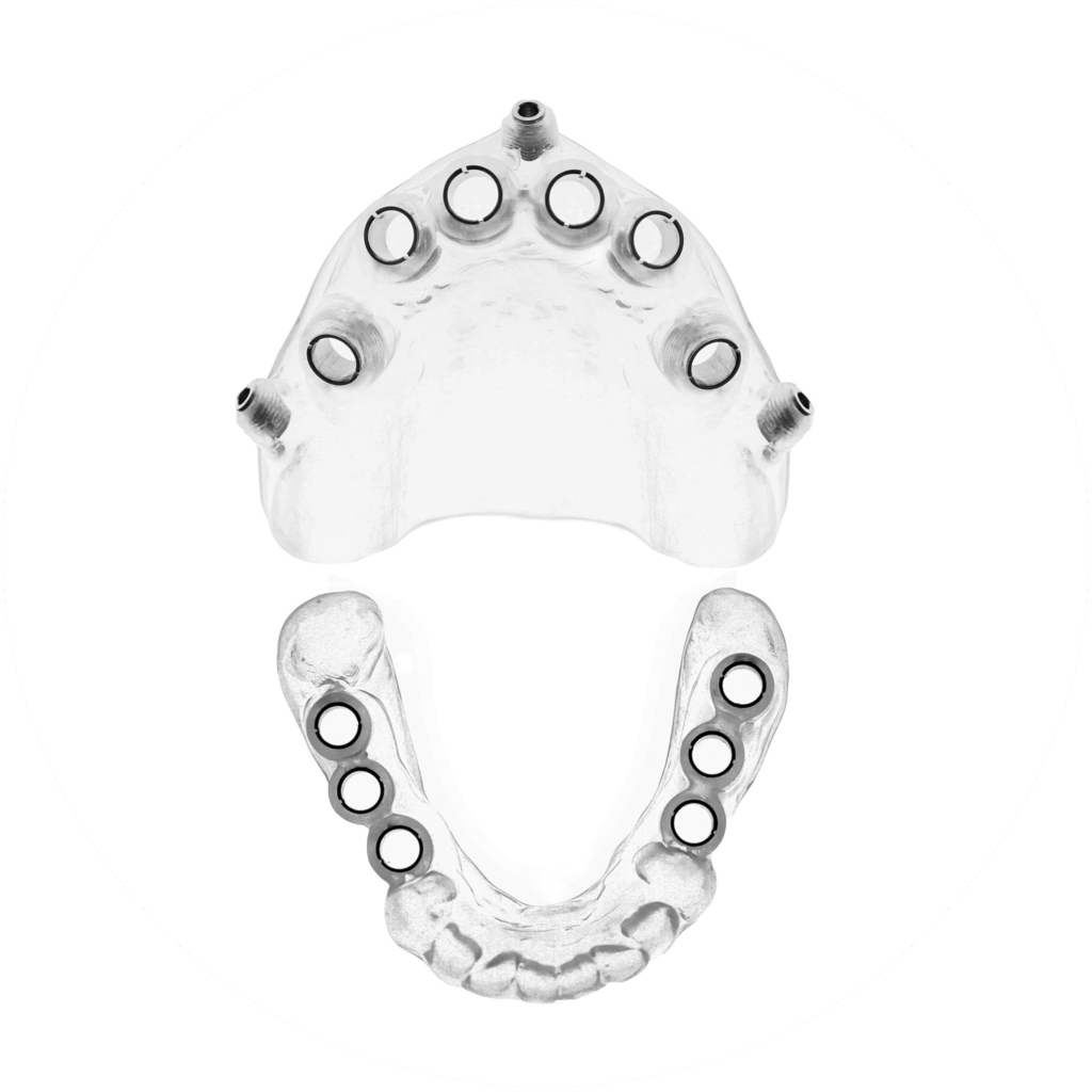 - A sablon mindig a kiválasztott implantációs rendszer kritériumainak megfelelően készül el orvosi akrilátból, a páciens CT felvétele alapján.