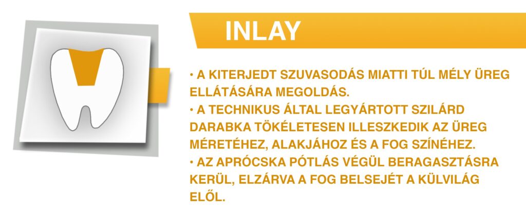 Abban az esetben, ha a fog jelentős része hiányzik, akkor a fogtechnikus által készített inlay jelenthet megfelelő megoldást. Készülhet kompozitból vagy porcelánból, de a végeredmény teljesen úgy néz ki, mint az eredeti fog. Az inlay kínálta lehetőséget a rágófogaknál lehet kihasználni, front fogak javítására fehér színű kompozit tömés, direkt héj, porcelán héj vagy cirkon korona ajánlható.