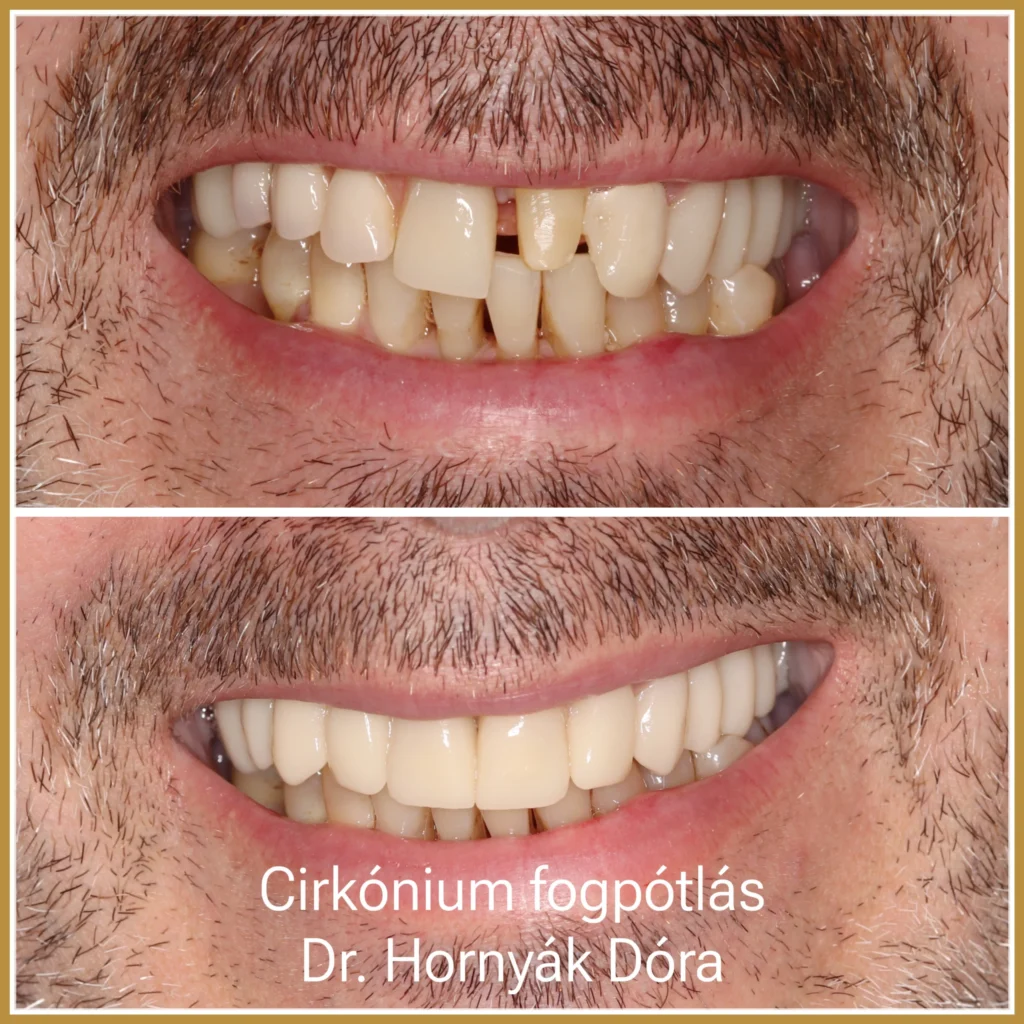 - A felső fogsor funkcióját és esztétikáját cirkónium koronák és cirkon fogászati hidak állították helyre.