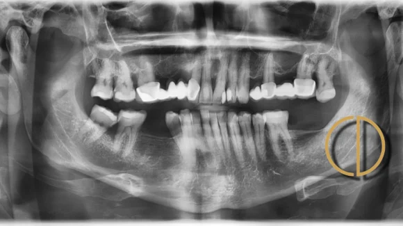 Az alsó fogsoron stratégiailag fontos rágófogak hiányoztak. A legutolsó, hátsó fogak hiánya különösen megnehezíti a fogpótlás tervezését, mivel teljes értékű, jól terhelhető hídpótlás ezek nélkül nem készíthető. Ilyen esetben reálisan két lehetőség jön szóba:
