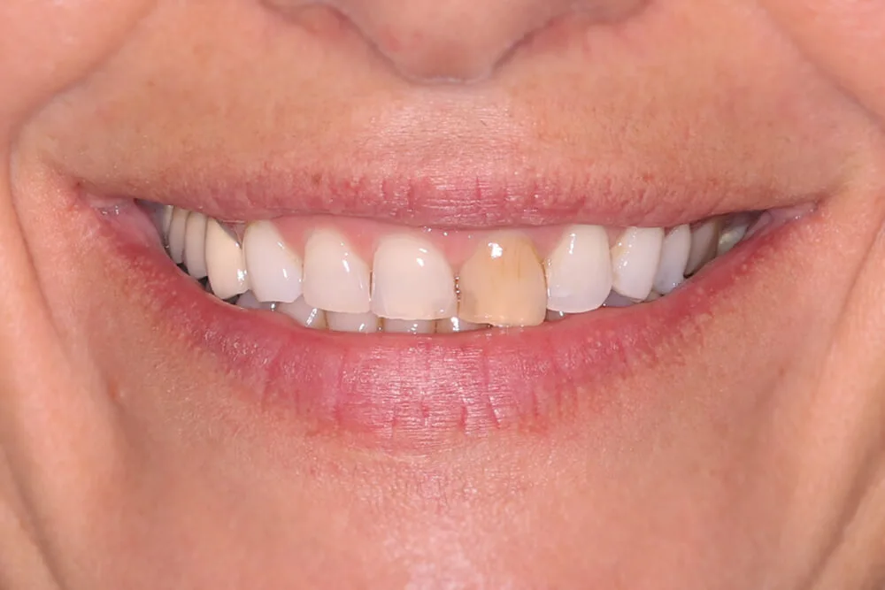 Páciensem esztétikai probléma miatt kereste fel rendelőnket. A bal felső nagymetsző fogának elszíneződése zavarta, mely egy gyökérkezelt fog volt.