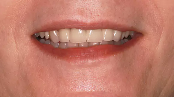 A mosolyzóna komplex kezelése jó döntés volt. A régi koronák lecserélése, valamint az implantátum helyén lévő csontseb és íny gyógyulása után kiemelkedő esztétikát tudtunk elérni az új foghíd segítségével.
