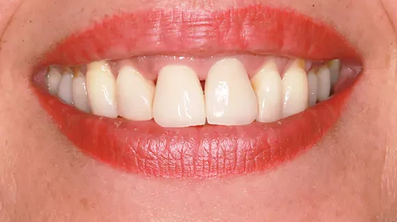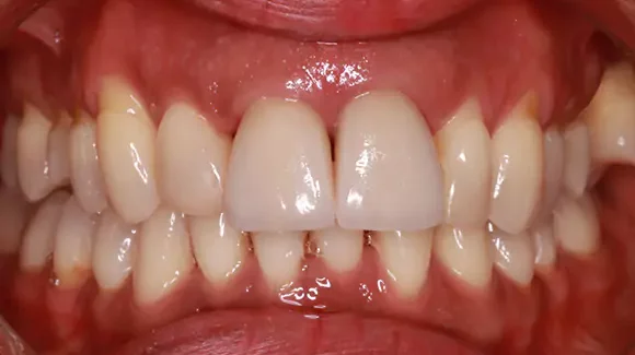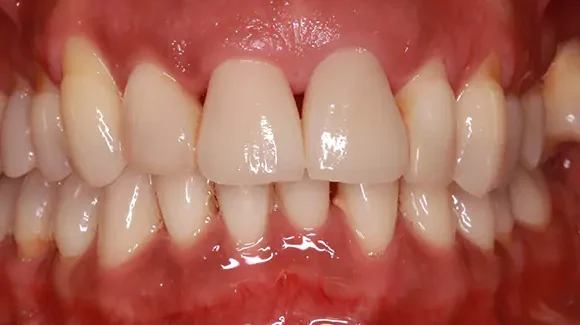 A nagymetszők koronái színben eltértek, jóval világosabbak voltak a szomszéd fogaktól, ráadásul hosszabbak és domborúbbak is voltak, ettől úgy érezte, kiállnak a sorból. Lófogaknak nevezte őket. Olyan esztétikus fogpótlást szeretett volna, amivel a mosolya fiatalosabbá válik. Fontos volt, hogy a fogak egy szintbe hozhatók- ugyanakkor fehérek is legyenek, de mégse üssenek el a környezetüktől.