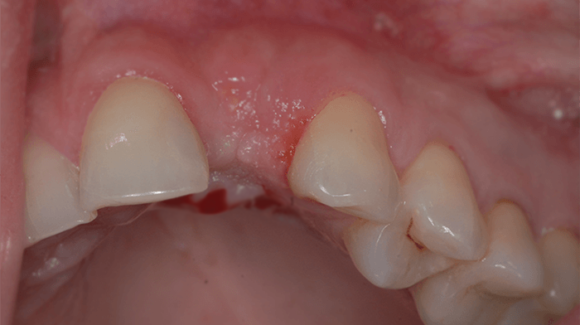 A fog gyökérkezeléssel való megmentésére minimális esély látszott, ráadásul a gyulladás kiterjedése miatt már a szomszédos fogak is veszélyeztetettek voltak. A foghúzást követően fogbeültetést javasoltam, s mivel a mosolyzónáról volt szó, így esztétikus cirkon implantátum beültetésére készítettem el a kezelési tervet.