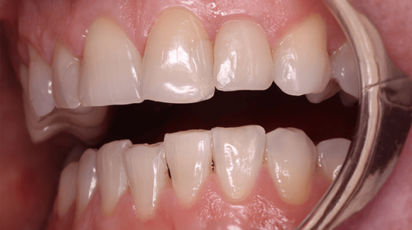 Implantációt követően az implantátumra ideiglenes korona készült, mellyel megkezdődhetett az ideális ínykontúr kialakítása. Amennyiben az implantátumra ideiglenes fogpótlás készül és nem klipsz segítségével fedjük a hiányt, akkor az ideiglenest a műgyökér csontosodásának idejére „kivesszük a harapásból”, vagyis nem éri terhelés.