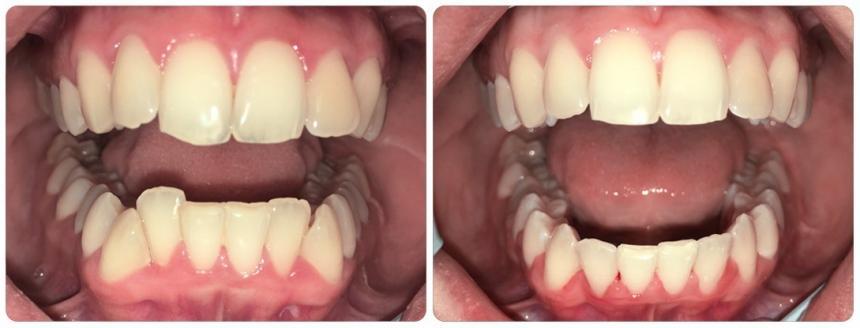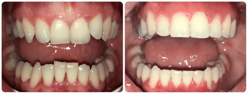 A fiatal hölgy esetében a kivehető és a rögzített készülék kombinációja vezetett sikerre. A felső állcsonton láthatatlan sínekkel dolgoztunk, míg alulra rögzített készüléket kapott.