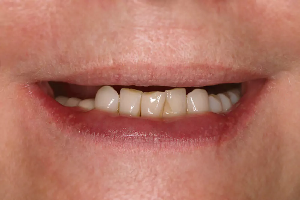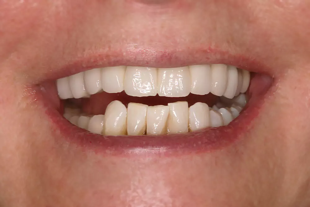 A hölgy a foghiány eltüntetésére végül implantátum beültetésre épülő, csavarral rögzülő cirkon foghíd pótlásra kapott komplex kezelési tervet.