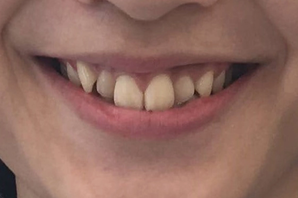 A fiatal 23 éves hölgy azért keresett meg, mert nem találta elég szépnek a mosolyát. Balett táncos lévén egy valóban vonzó mosoly volt a vágya, melyet láthatatlan, kerámia fogszabályzó segítségével szeretett volna elérni.