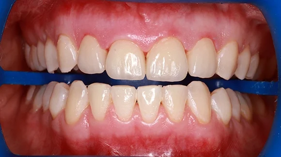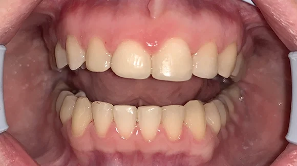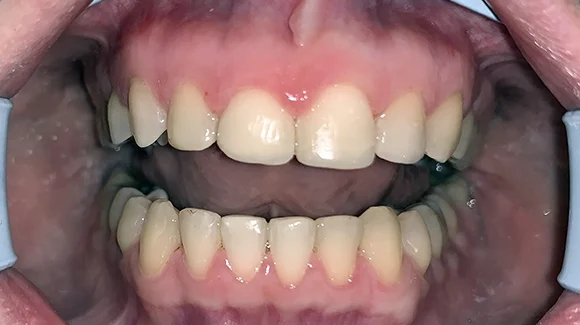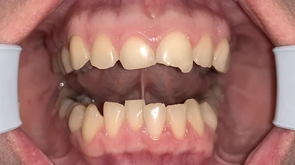 Mire hozzám került a páciens, addigra a felső metszőfogainak nagy részét tömés borította és sajnos már alig maradt ép foganyag. Ez, és a fogszabályozóval kijavított harapási probléma voltak a legfőbb okai annak, hogy újra és újra javítani, tömögetni kellett ezeket a fogakat.