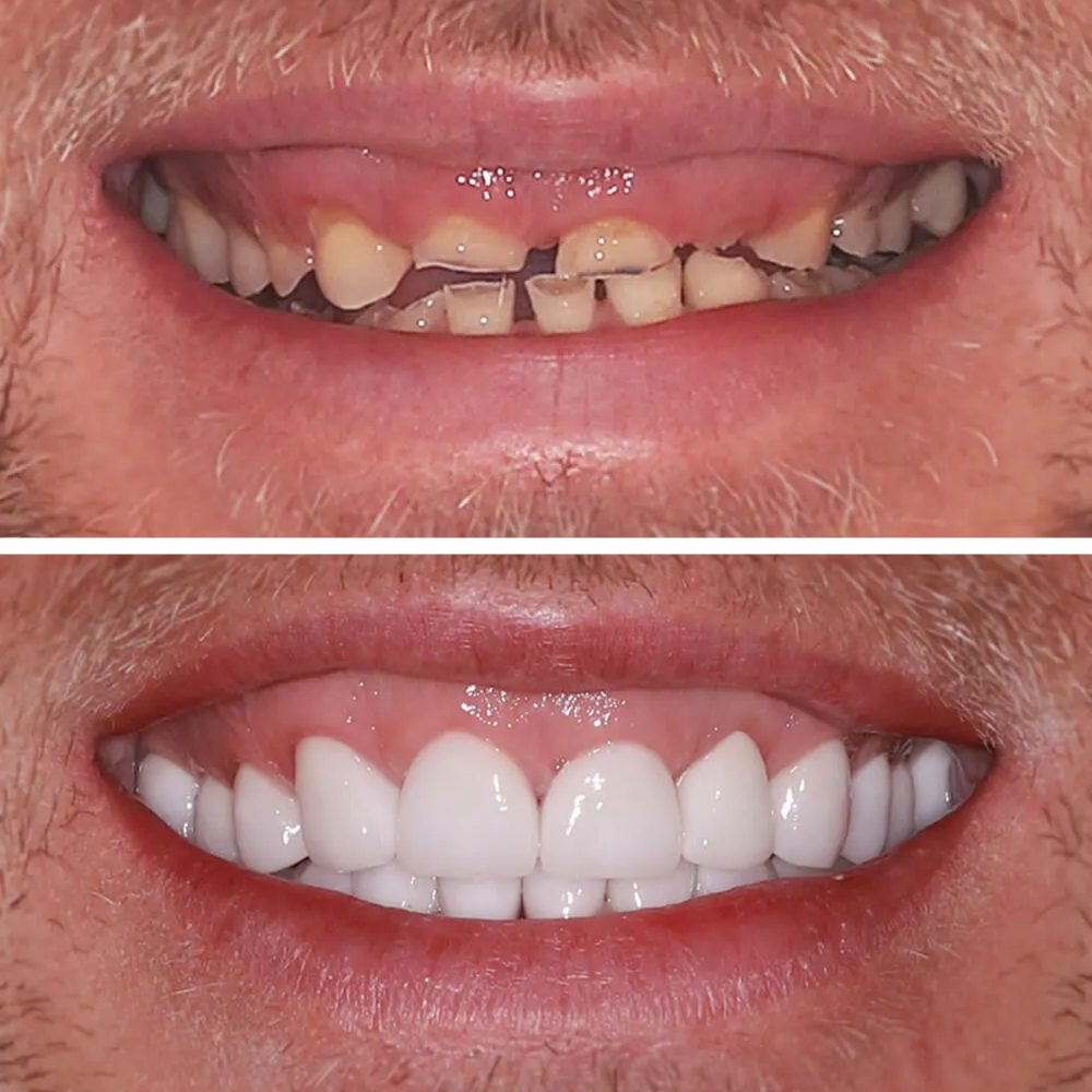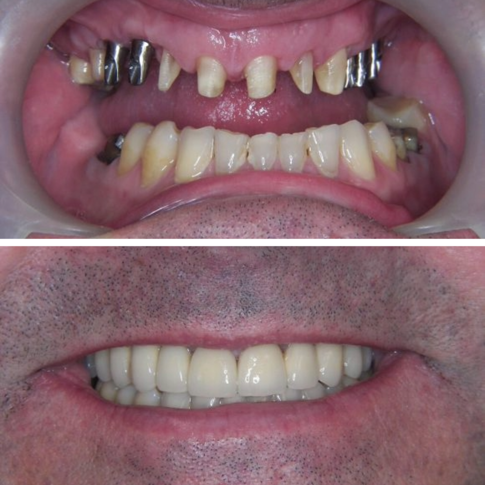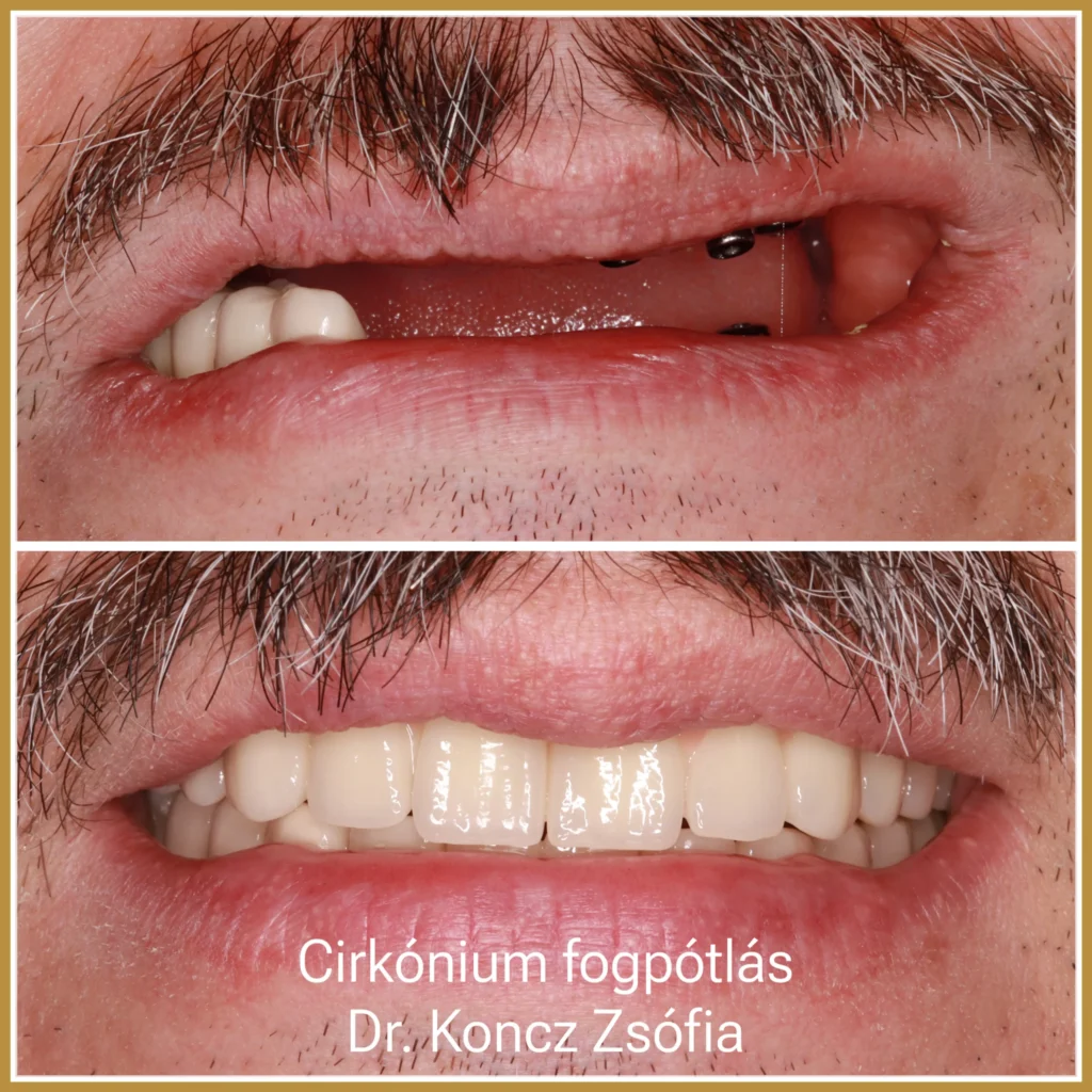 Páciensem azzal a problémával érkezett, hogy a meglévő felső híd és több fog rendkívül rossz állapotban volt, a jobb felső híd a fogakkal együtt kitört, és csak a menthetetlen, letört fogak gyökerei maradtak. A teljes száj állapotát figyelembe véve a kezelés komplex rehabilitációt igényelt a felső és az alsó fogsorban egyaránt.